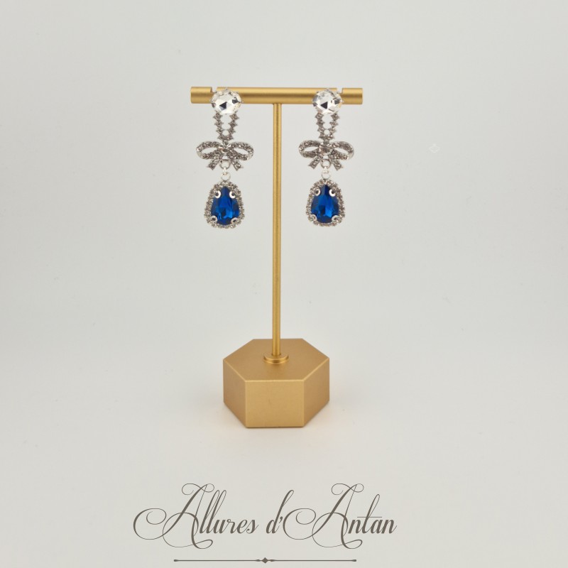 Boucles d'oreilles XVIIIe Noeud Argenté - strass Bleu