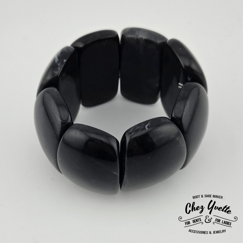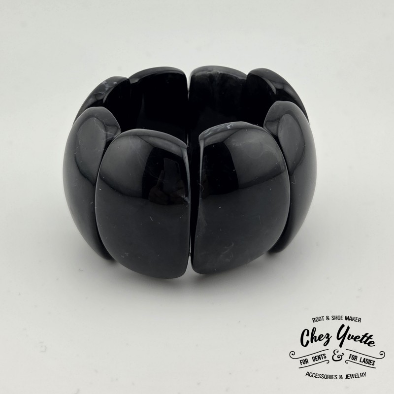 Plongez dans l’élégance des années 40 avec ce somptueux bracelet extensible signé Chez Yvette. Son design vintage met en valeur des formes généreuses et un fini marbré unique, rappelant le charme intemporel des bijoux d’époque.