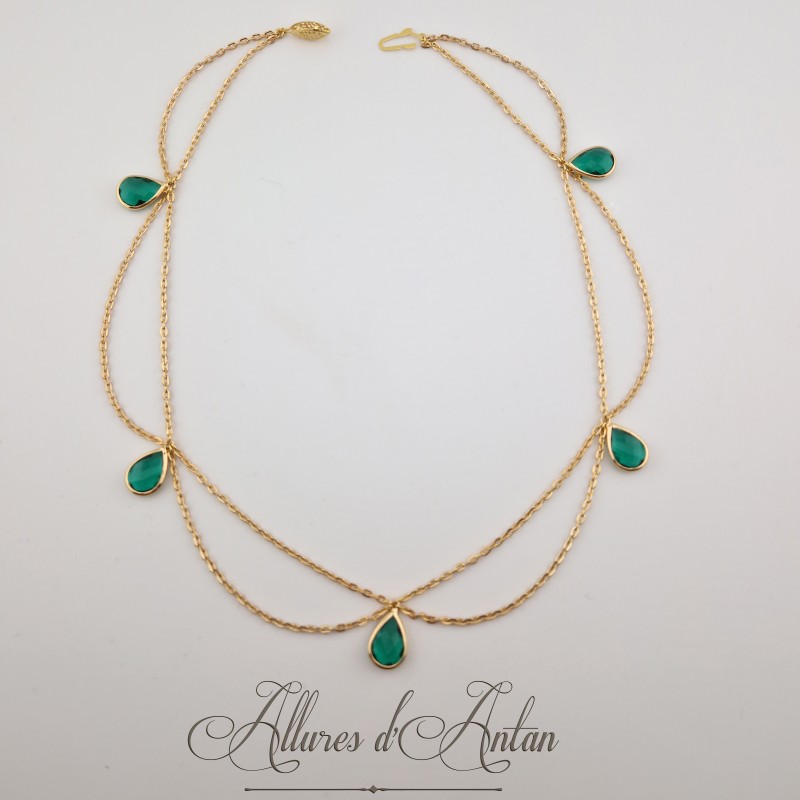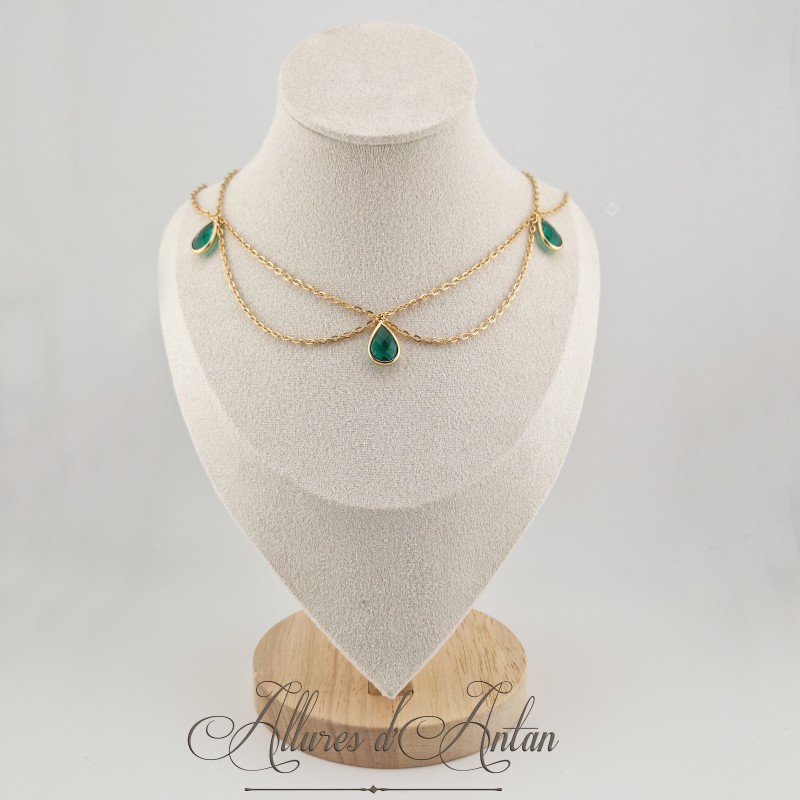 Collier en esclavage , chaine et strass en verre, coloris VERT