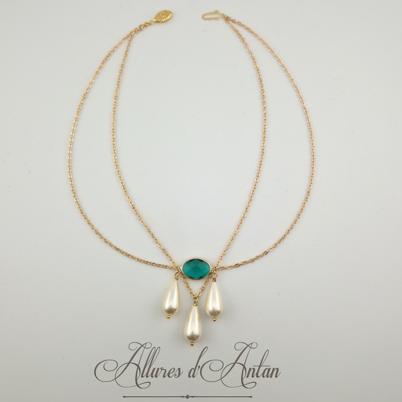 Collier en esclavage , chaine et strass en verre, coloris VERT